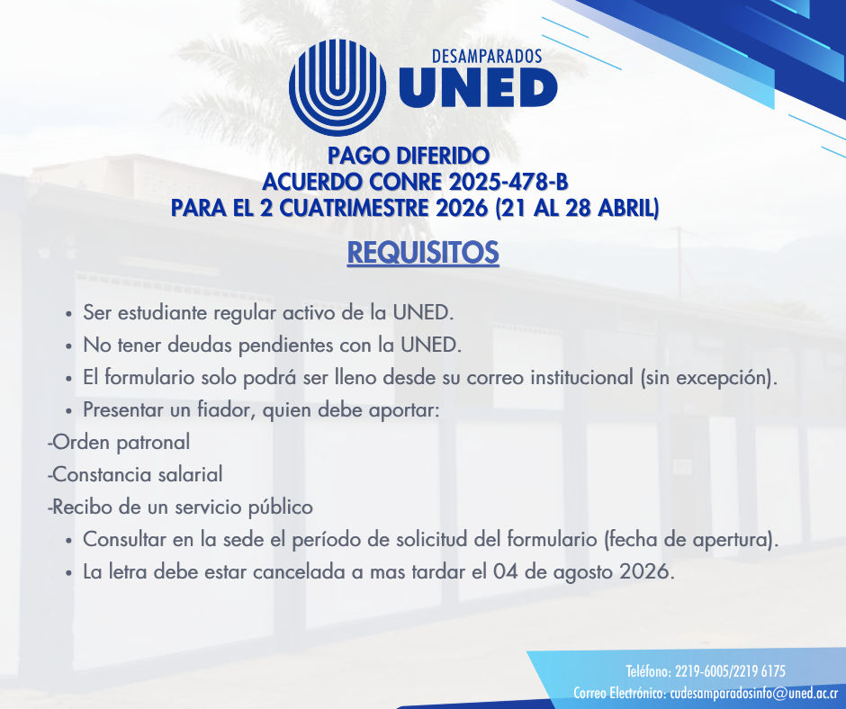 Correo electrónico para consultas generales, adelantos y liquidaciones de gastos: cudesamparadosinfo@uned.ac.cr