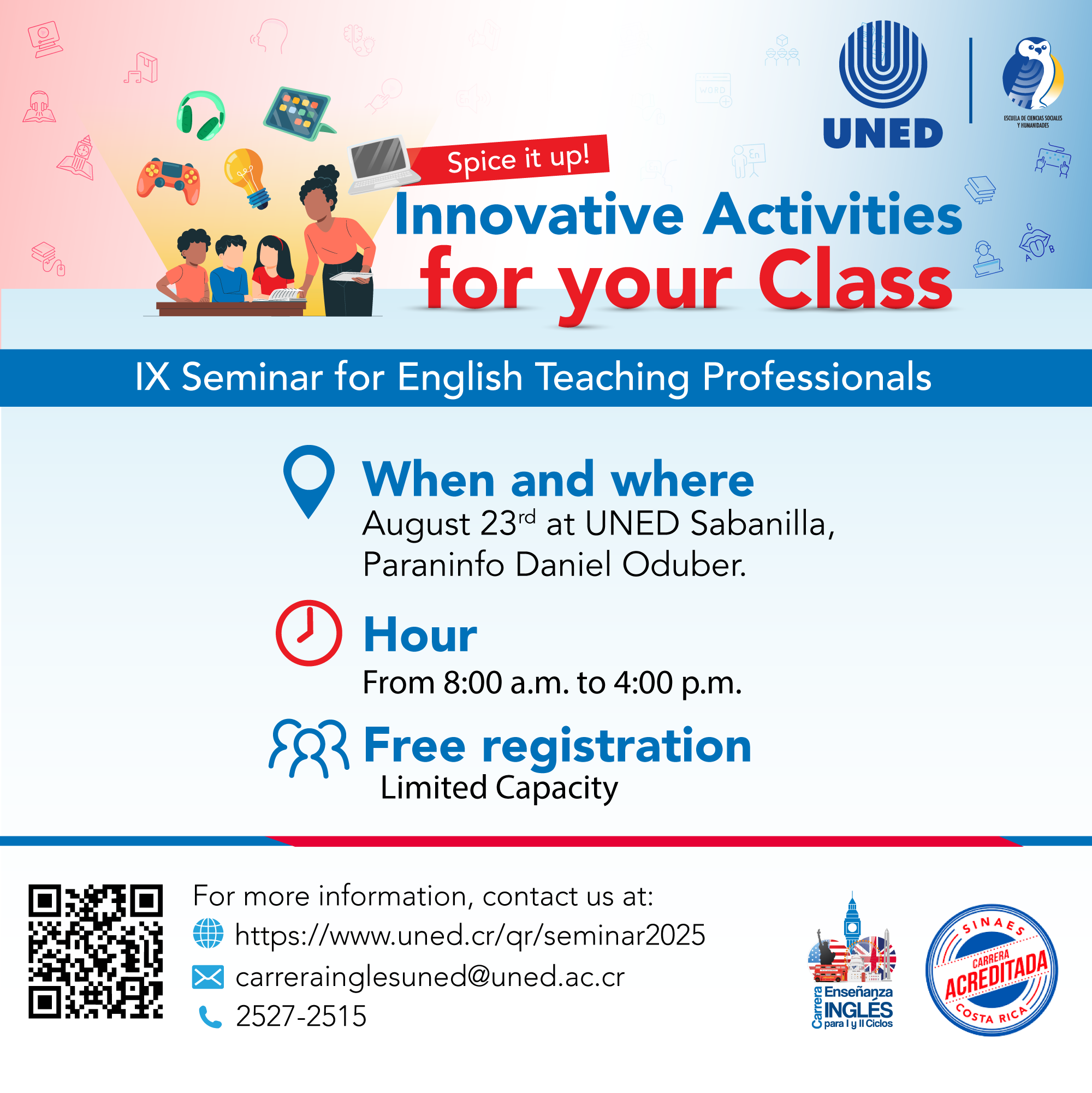 El equipo de trabajo de la carrera desarrolla cada año un espacio de actualización profesional dirigido a estudiantes, personas graduadas y docentes de la enseñanza del inglés. A continuación, se presenta el historial de actividades en donde se pueden consultar los materiales y grabaciones de las exposiciones nacionales e internacionales invitados.