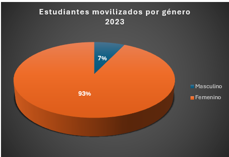 En el 2023 se movilizaron 14 estudiantes, por género 93% femenino y 7% masculino. En cuanto a los tipos de actividad 1 asistió a un curso corto, 11 a pasantías y 2 a Congresos. En cuanto a las regiones a las que asistieron 5 a Europa, 1 a América del Norte, 6 a América del Sur y 2 a América Central. En la imagen se puede visualizar los gráficos correspondientes.